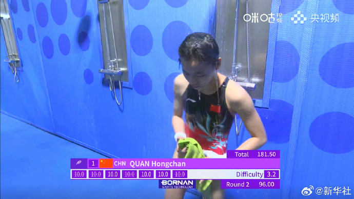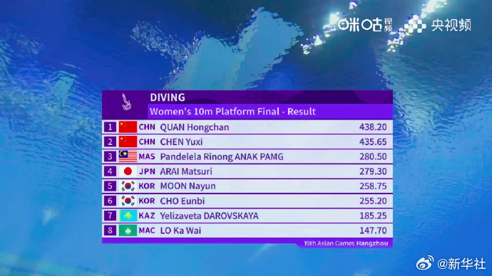 在3日進(jìn)行的杭州亞運(yùn)會跳水女子10米臺決賽中,全紅嬋最后一跳逆轉(zhuǎn)奪金,陳芋汐摘銀。(記者:周欣 夏亮)