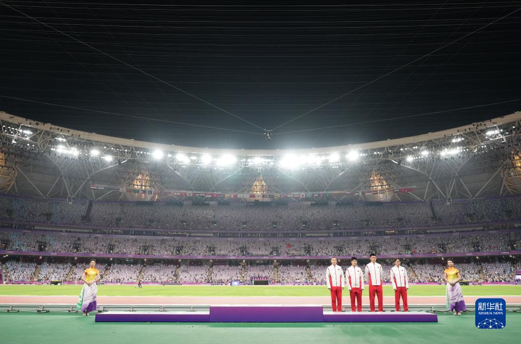 10月4日,湯星強、謝震業(yè)、蘇炳添、吳智強(頒獎臺上從右至左)在頒獎儀式上。