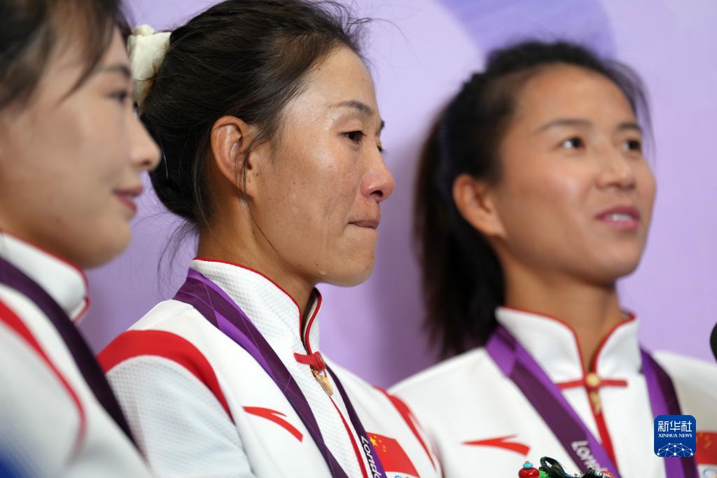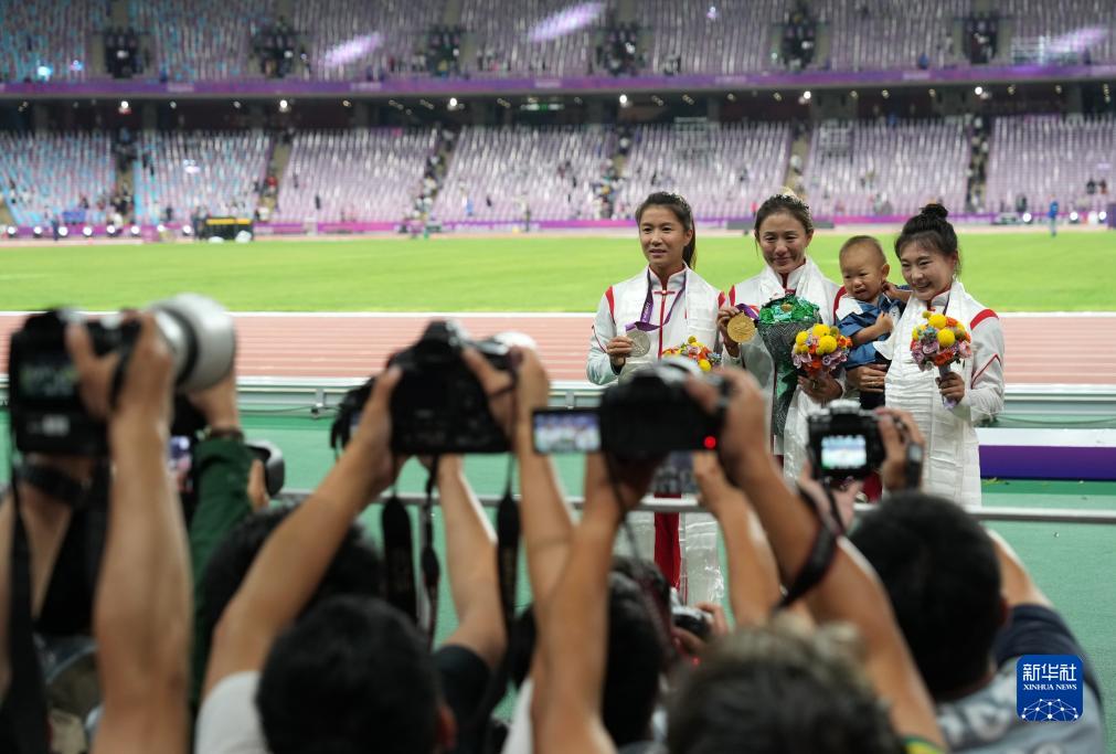 10月4日,切陽什姐(中)、劉虹(右)、呂秀芝(左)在頒獎儀式后展示獎牌。