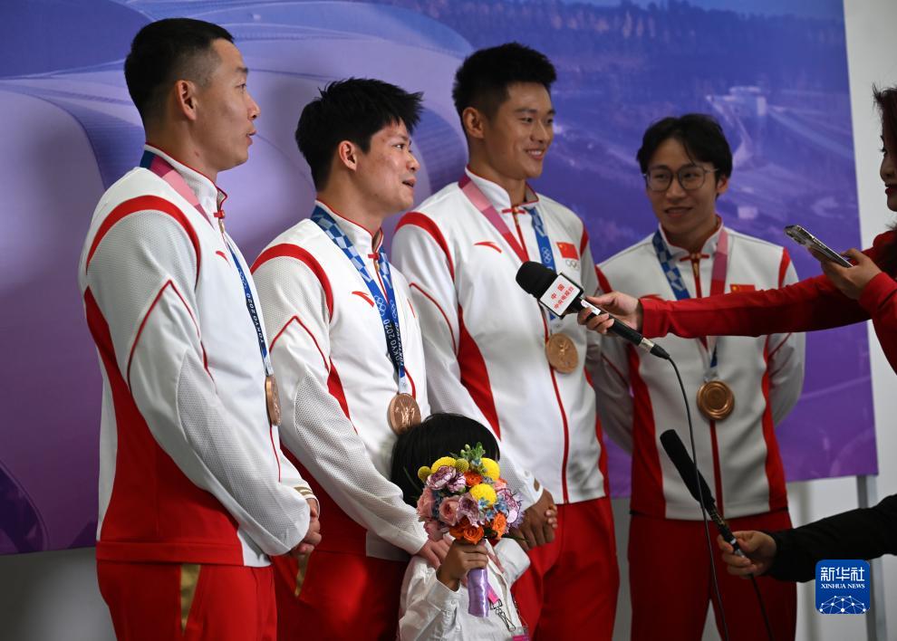 10月4日,湯星強、謝震業(yè)、蘇炳添、吳智強(從右至左)在頒獎儀式后接受采訪。