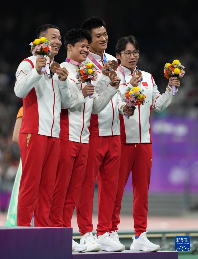 10月4日,湯星強、謝震業(yè)、蘇炳添、吳智強(從右至左)在頒獎儀式后展示獎牌。