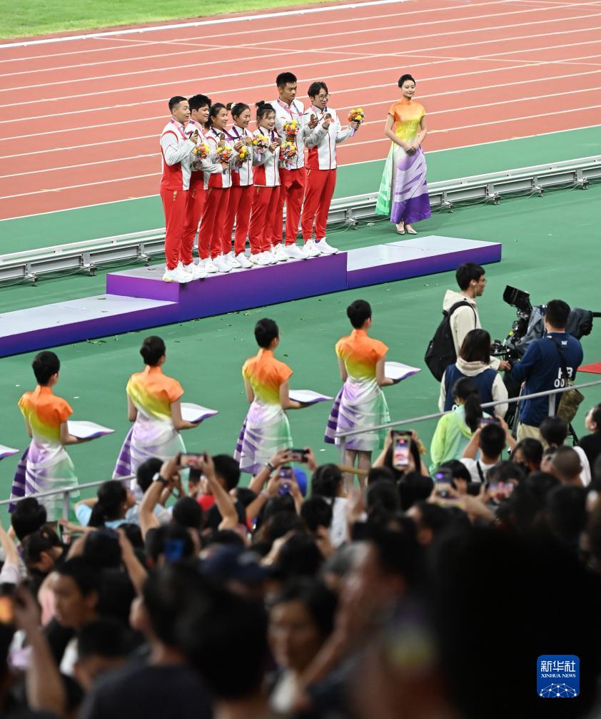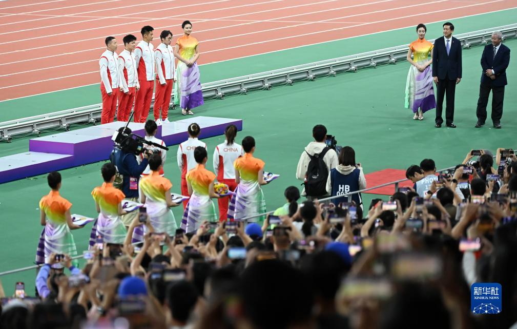 當晚,杭州亞運會田徑項目比賽結(jié)束后,中國奧委會在杭州奧體中心體育場舉行遞補奧運獎牌頒獎儀式,為遞補獲得東京奧運會男子4X100米接力銅牌的蘇炳添、謝震業(yè)、吳智強和湯星強與遞補獲得2012年倫敦奧運會女子20公里競走金、銀、銅牌的切陽什姐、劉虹、呂秀芝頒發(fā)獎牌。新華社記者 江漢 攝