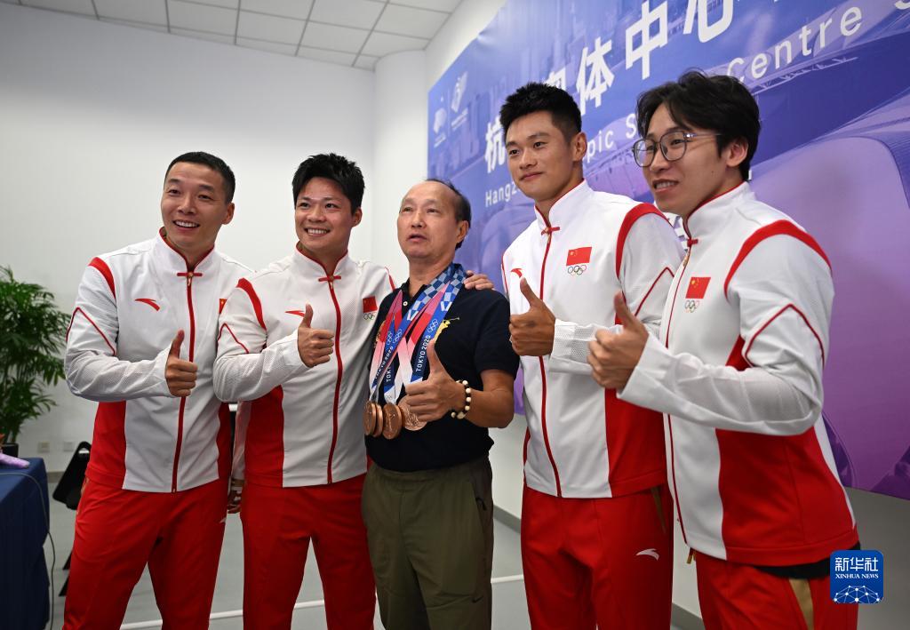 10月4日,湯星強、謝震業(yè)、蘇炳添、吳智強(后排從右至左)和蘇炳添的兒子蘇浩宸(前)在頒獎儀式后。