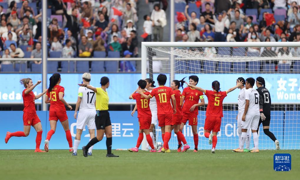 10月6日,中國(guó)隊(duì)球員在比賽中慶祝進(jìn)球。新華社記者 賈浩成 攝