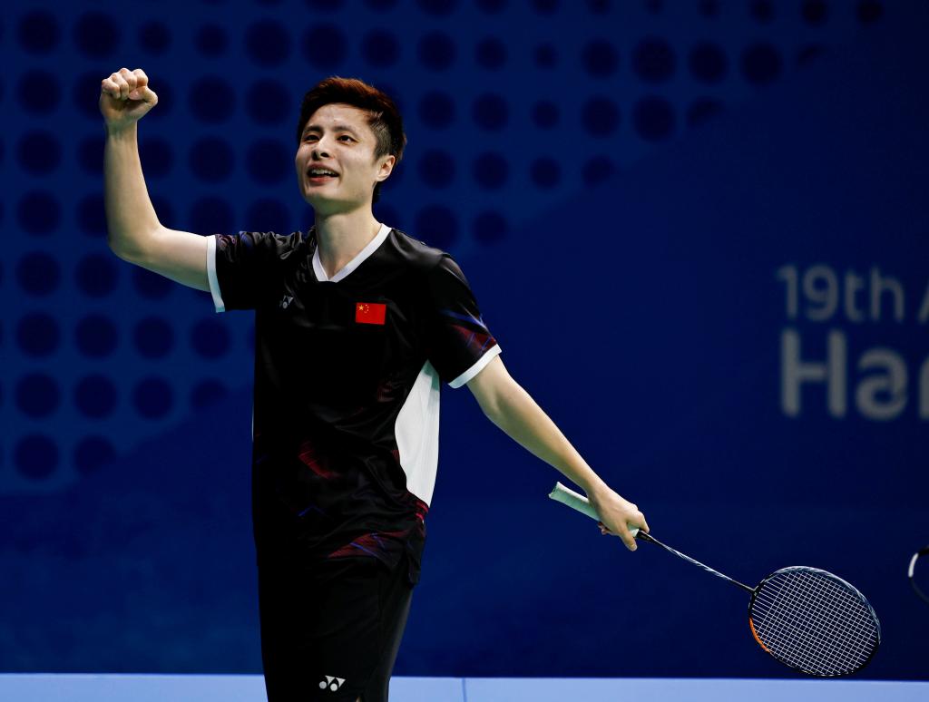 10月6日,石宇奇在獲勝后慶祝。新華社記者 任正來(lái) 攝
