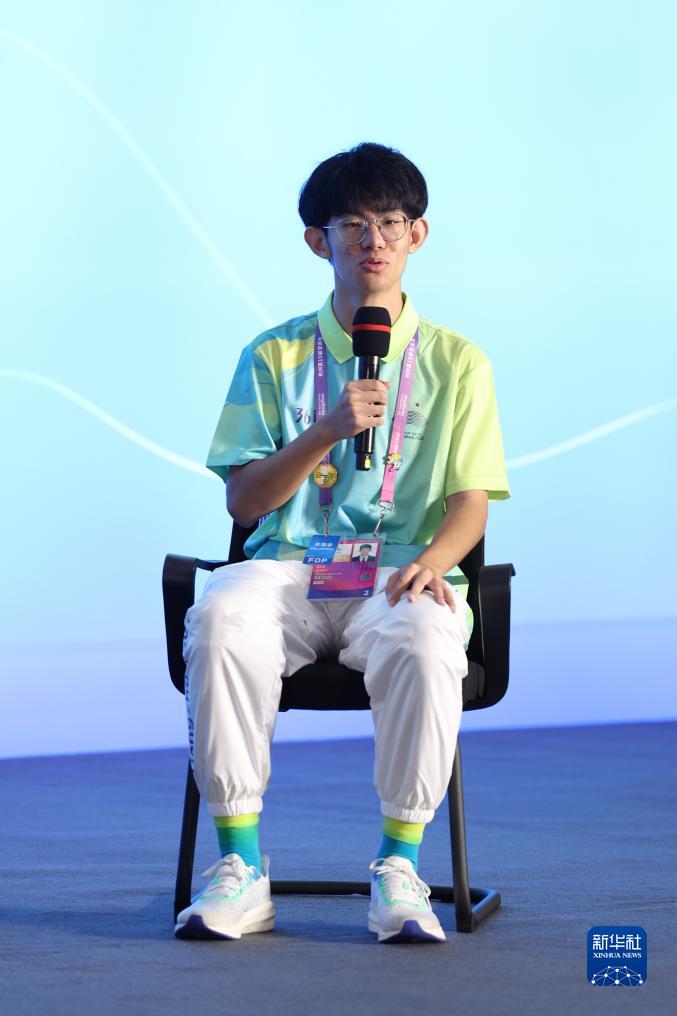 10月7日,杭州奧體中心籃球館競(jìng)賽志愿者李冠霖在見面會(huì)現(xiàn)場(chǎng)發(fā)言。