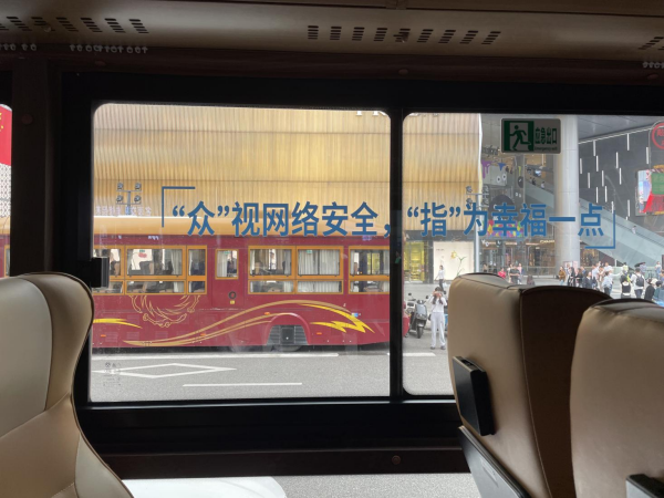 在網(wǎng)絡(luò)普法公交的車窗上,也“隱藏”著網(wǎng)絡(luò)普法金句——“眾”視網(wǎng)絡(luò)安全,“指”為幸福一點(diǎn)!隨著車輛在大街小巷間穿梭,沉浸式學(xué)法帶給每位乘客全新的體驗(yàn),普法真正“動”了起來。