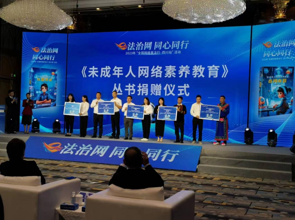 青少年是祖國(guó)的未來,也是網(wǎng)上學(xué)習(xí)、交流、生活最活躍的參與者、實(shí)踐者。為營(yíng)造風(fēng)清氣正的網(wǎng)絡(luò)空間,守護(hù)青少年健康上網(wǎng),10月11日上午,在2023年“全國(guó)網(wǎng)絡(luò)普法行·四川站”啟動(dòng)儀式上,多家愛心企業(yè)向四川省中小學(xué)捐贈(zèng)《未成年人網(wǎng)絡(luò)素養(yǎng)教育》叢書。