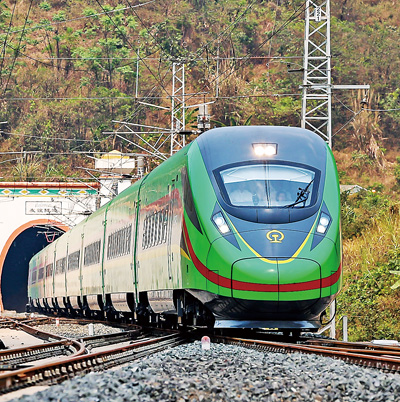 “復(fù)興號(hào)”動(dòng)車組從中老鐵路友誼隧道穿行而出。