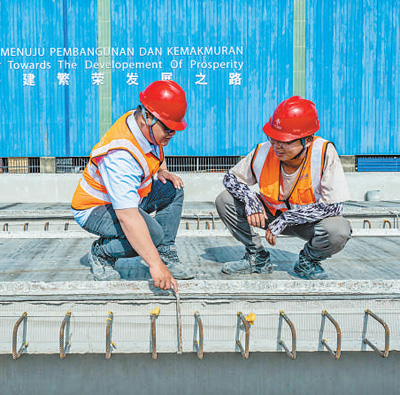 馬來西亞吉蘭丹州的馬東鐵項(xiàng)目一分部制梁場(chǎng),技術(shù)人員討論生產(chǎn)情況。
