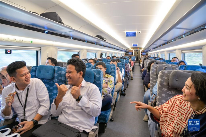 10月17日,乘客在行駛中的雅萬(wàn)高鐵高速動(dòng)車組列車車廂內(nèi)交談。新華社記者 徐欽 攝