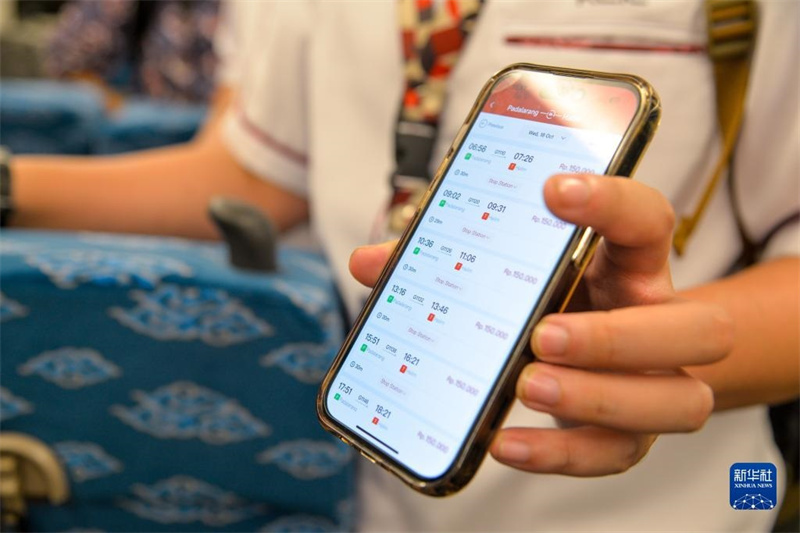 10月17日,一名乘客在行駛中的雅萬(wàn)高鐵高速動(dòng)車組列車車廂內(nèi)展示雅萬(wàn)高鐵購(gòu)票手機(jī)應(yīng)用。新華社記者 徐欽 攝
