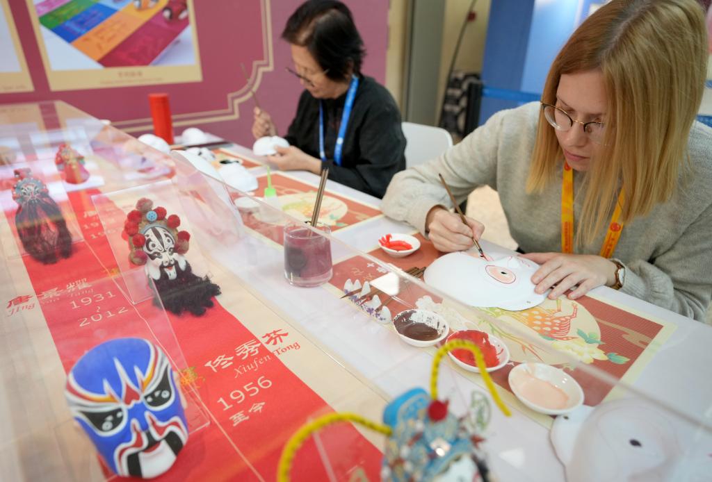 10月16日,在第三屆“一帶一路”國(guó)際合作高峰論壇新聞中心,來(lái)自比利時(shí)的記者(右)體驗(yàn)畫京劇臉譜。新華社記者 王毓國(guó) 攝