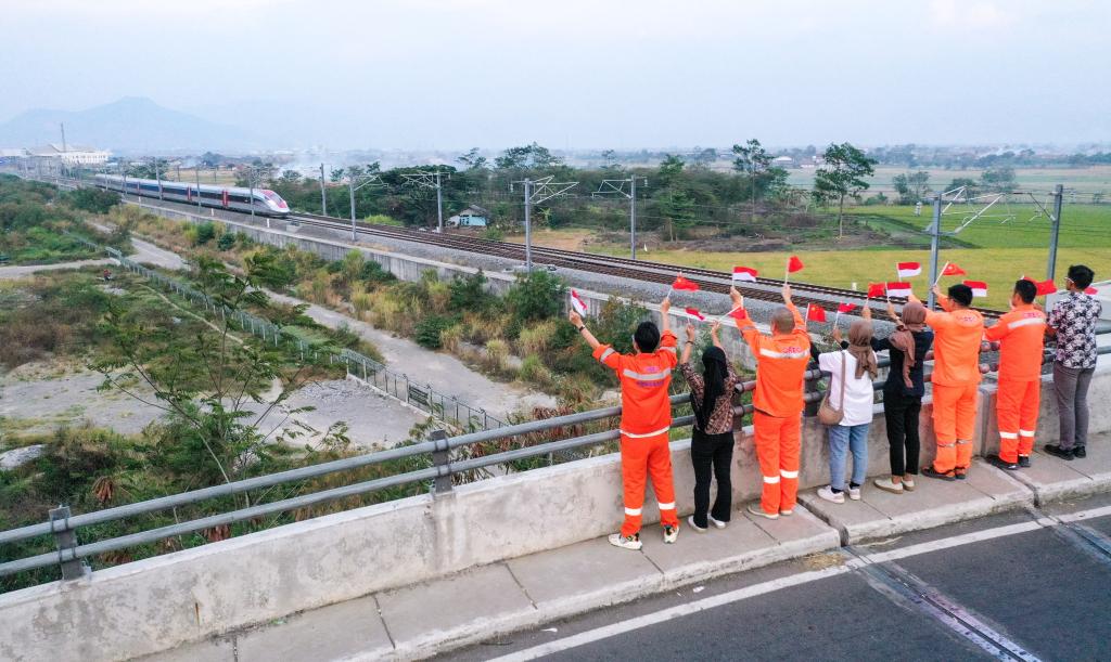 10月17日,在印度尼西亞萬隆一座天橋上,雅萬高鐵建設(shè)單位之一中鐵電氣化局的中國和印尼籍員工揮舞著中國和印尼兩國國旗,向遠(yuǎn)處駛來的一列雅萬高鐵高速動(dòng)車組列車歡呼(無人機(jī)照片)。新華社記者徐欽攝