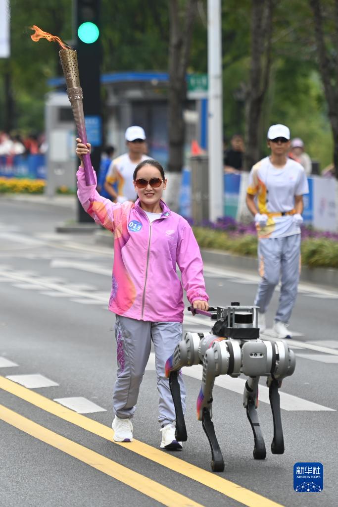10月19日,火炬手蔡瓊卉在智能導(dǎo)盲犬的引導(dǎo)下進(jìn)行火炬?zhèn)鬟f。這是智能導(dǎo)盲犬首次在大型賽事火炬?zhèn)鬟f中亮相,它以四足智能機(jī)器人視覺(jué)識(shí)別能力引導(dǎo)視障殘疾人行走。新華社記者 黃宗治 攝
