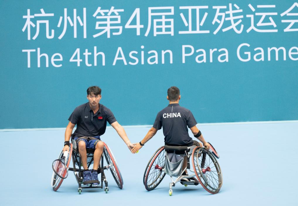 10月24日,董順江(右)/紀(jì)珍旭在比賽中擊掌。新華社記者才揚(yáng)攝
