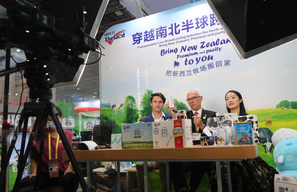 新西蘭紐仕蘭乳業(yè)有限公司執(zhí)行總裁羅伊·范登克(中)在第三屆進(jìn)博會展臺上搭建的網(wǎng)絡(luò)直播間出鏡帶貨。新華社記者方喆 攝