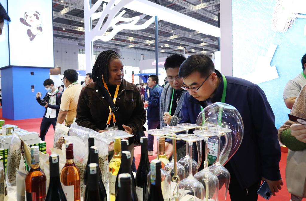 11月6日,來(lái)自坦桑尼亞的艾斯黛拉(前左)向參觀者介紹展品。新華社記者 方喆 攝