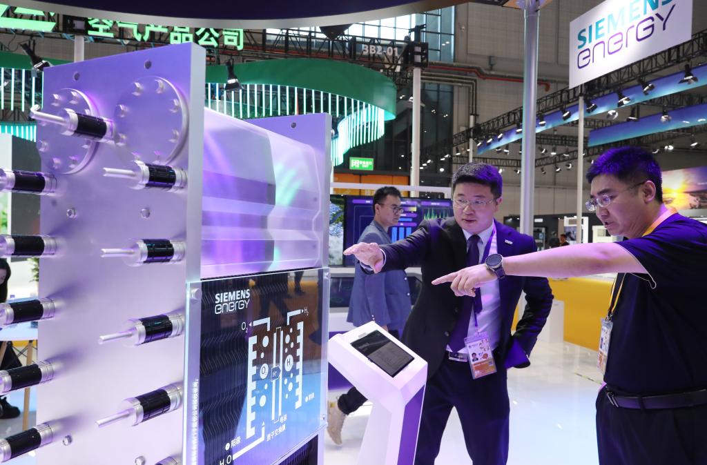 11月5日,工作人員(左)介紹第六屆進(jìn)博會(huì)西門子公司展出的電解水制氫裝置模型。新華社記者 方喆 攝