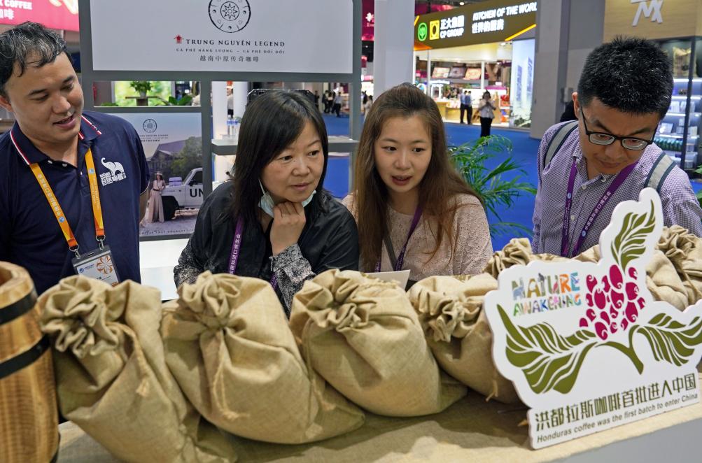 11月5日,觀眾在第六屆進(jìn)博會(huì)食品及農(nóng)產(chǎn)品展區(qū)參觀首次亮相中國(guó)的洪都拉斯咖啡豆。新華社記者 劉穎 攝