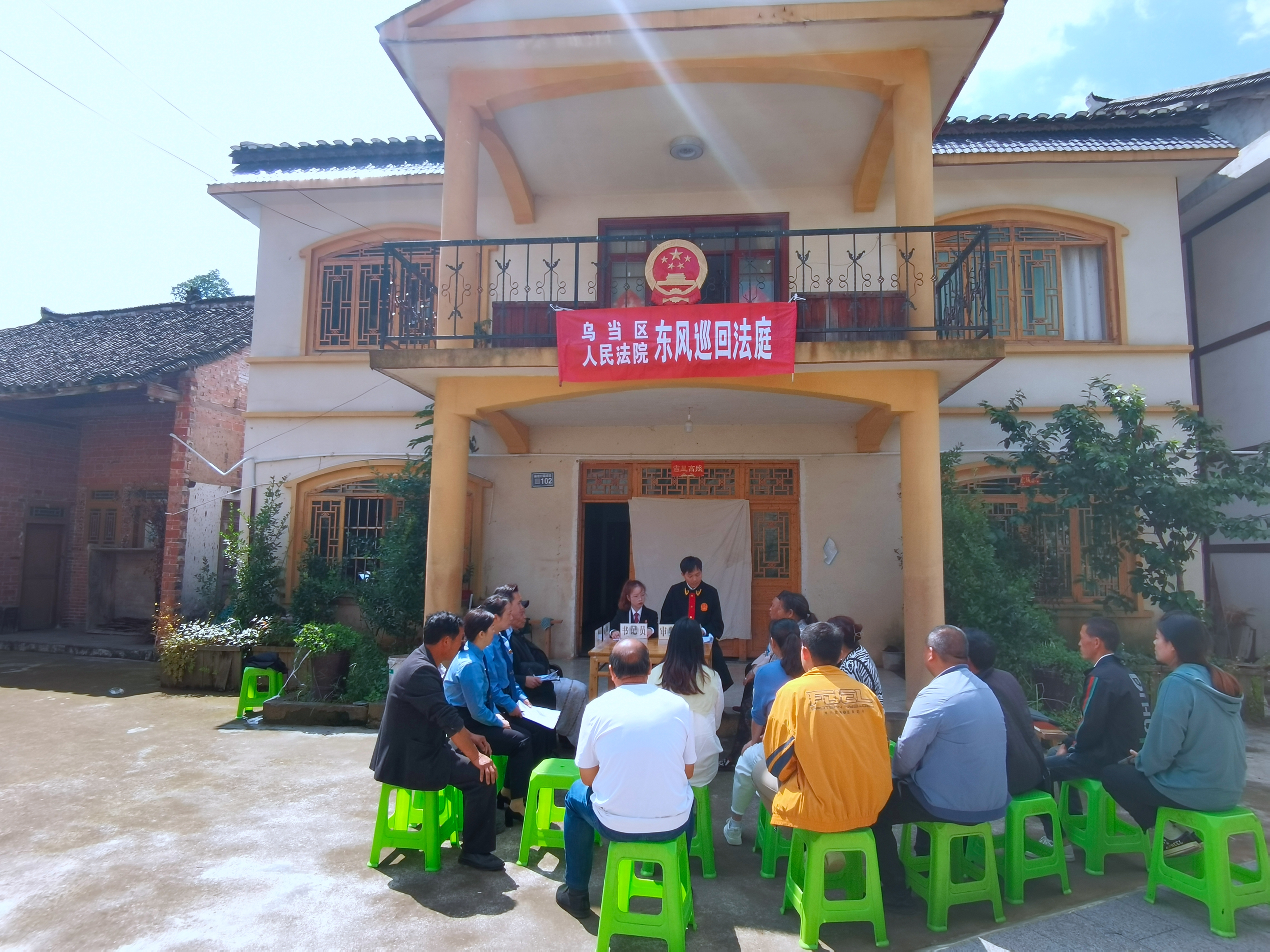 國(guó)徽掛欄,庭設(shè)院中,5月16日,烏當(dāng)區(qū)偏坡鄉(xiāng)偏坡村的一處農(nóng)家院里,烏當(dāng)區(qū)人民法院東風(fēng)法庭“就地取材”,在農(nóng)戶家的“飯桌”上進(jìn)行了一場(chǎng)巡回審判,公開(kāi)審理一起贍養(yǎng)費(fèi)糾紛案件,烏當(dāng)區(qū)檢察院派員出庭支持起訴。案件的訴訟參與人及其親屬、烏當(dāng)區(qū)司法局偏坡鄉(xiāng)司法所、偏坡鄉(xiāng)平安辦等部門人員及部分村民一同參加了庭審。