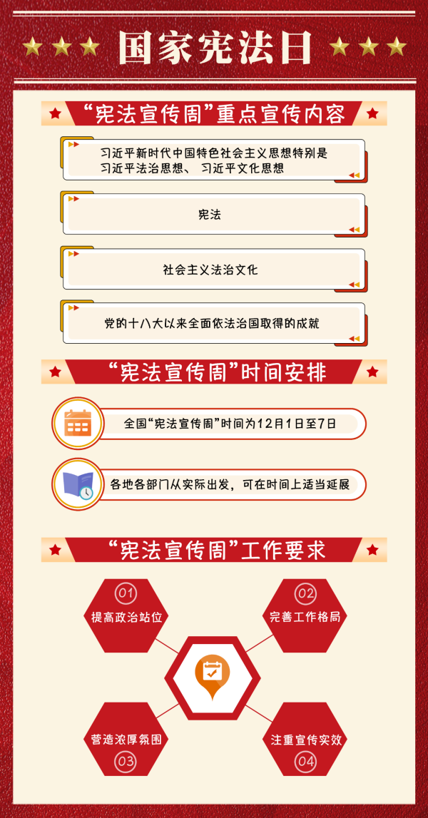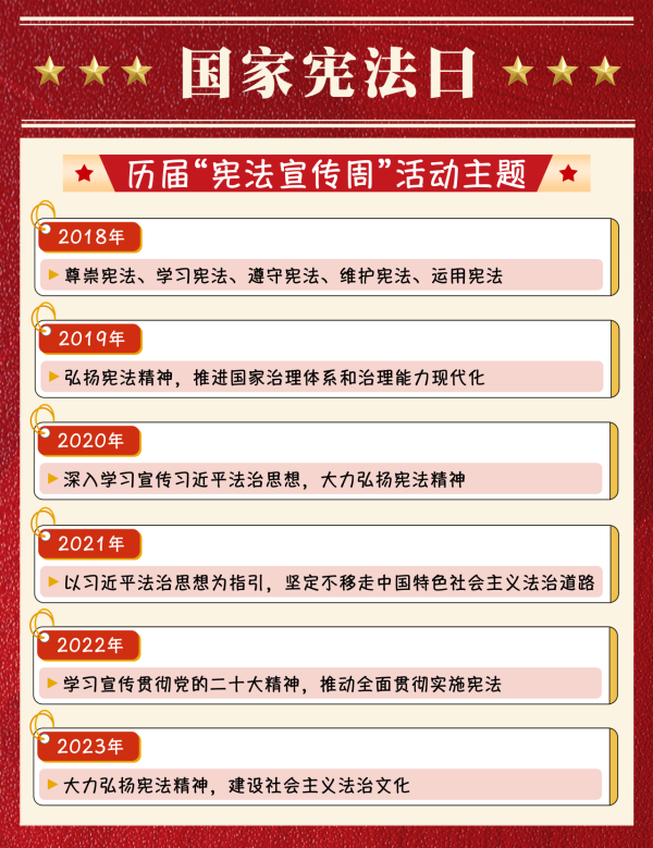 2023年12月4日是第十個國家憲法日,12月1日至7日是第六個“憲法宣傳周”,主題是“大力弘揚憲法精神,建設(shè)社會主義法治文化”。