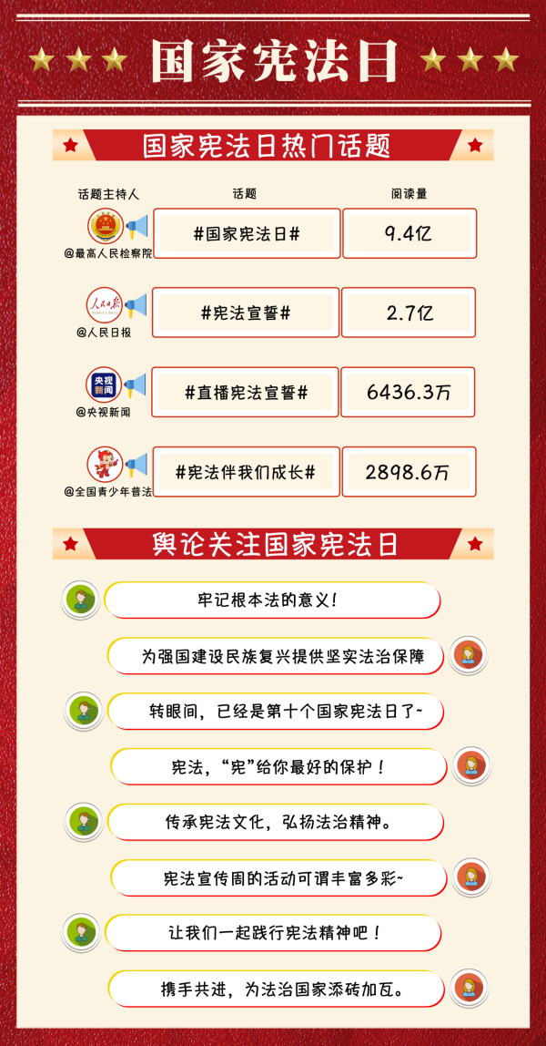 在第十個國家憲法日到來之際,多方積極宣傳相關(guān)信息,形成了多渠道、深層次的傳播格局,為弘揚憲法精神創(chuàng)造良好輿論氛圍?!?國家憲法日#”“#憲法宣誓#”等微博熱門話題閱讀量分別達到9.4億余次、2.7億余次?!稗D(zhuǎn)眼間,已經(jīng)是第十個國家憲法日了”“傳承憲法文化,弘揚法治精神”“攜手共進,為法治國家添磚加瓦”等網(wǎng)民留言高居評論區(qū)前排。