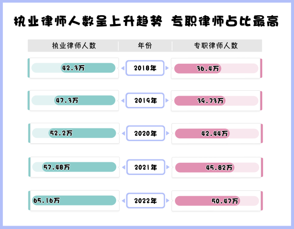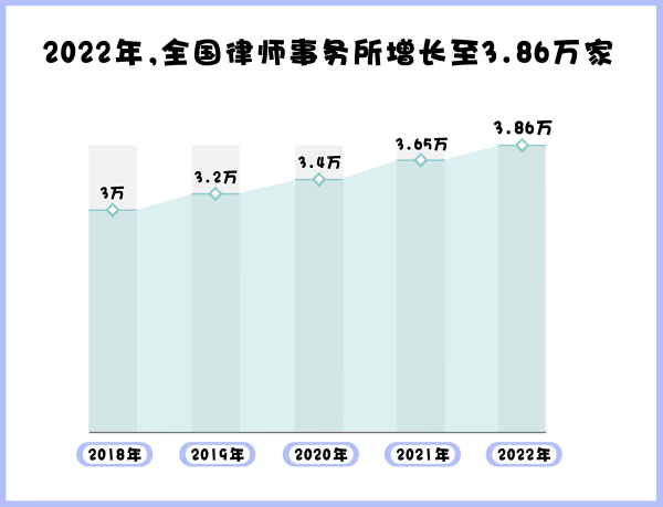 據(jù)司法部發(fā)布的官方數(shù)據(jù),截至2022年底,全國執(zhí)業(yè)律師已達(dá)65.16萬多人,全國律師事務(wù)所數(shù)量已經(jīng)增長至3.86萬家,我國律師隊伍不斷壯大。