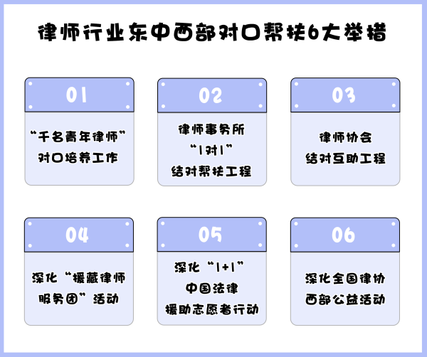 為有效推進(jìn)律師行業(yè)東中西部對口幫扶工作,《關(guān)于建立健全律師行業(yè)東中西部對口幫扶機制的方案》列舉了如下措施。