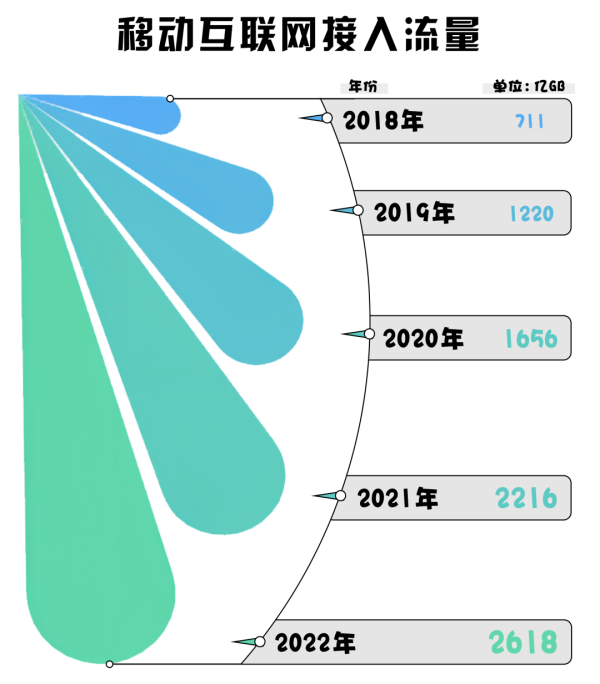 移動(dòng)互聯(lián)網(wǎng)是移動(dòng)通信、互聯(lián)網(wǎng)二者的結(jié)合體,通過移動(dòng)互聯(lián)網(wǎng),人們可以地鐵上使用手機(jī)、平板電腦等移動(dòng)終端瀏覽新聞、刷短視頻等。2022 年,我國移動(dòng)互聯(lián)網(wǎng)接入流量達(dá) 2618 億 GB,同比增長 18.1%。