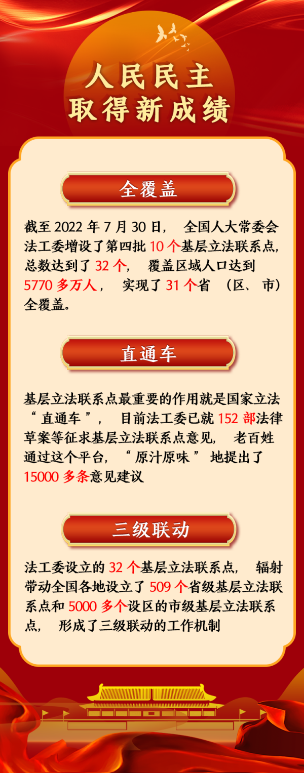 截至2022年7月30日,全國人大常委會法工委增設(shè)了第四批10個基層立法聯(lián)系點,總數(shù)達到了32個,實現(xiàn)了31個?。▍^(qū)、市)全覆蓋。32個基層立法聯(lián)系點覆蓋區(qū)域人口達到5770多萬人,越來越多的老百姓在家門口就能對關(guān)切的法律問題發(fā)表意見、表達訴求。
