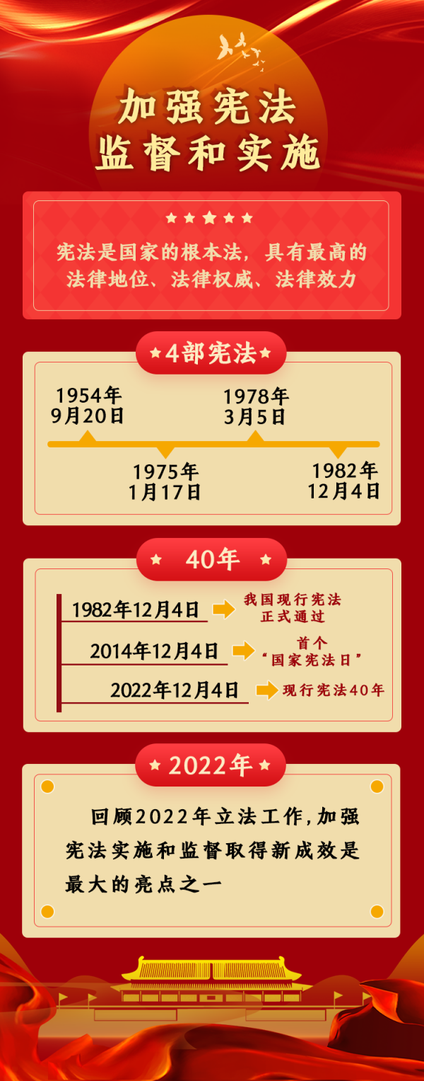 2022年是我國現(xiàn)行憲法公布施行40周年。這40年,也是我國改革開放深入推進、經(jīng)濟社會迅速發(fā)展、人民生活水平不斷提高的40年?;仡?022年立法工作,加強憲法實施和監(jiān)督取得新成效是最大的亮點之一。具體包括,不斷健全保證憲法全面實施的制度體系,通過完備的法律保證憲法實施,嚴格落實合憲性審查制度機制,深入推進合憲性審查工作,更好發(fā)揮憲法在治國理政中的重要作用,維護憲法權(quán)威和尊嚴。