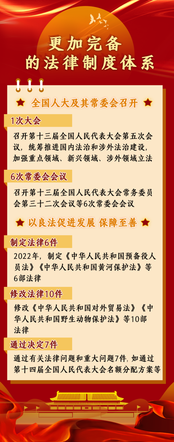 據(jù)統(tǒng)計,2022年,全國人大及其常委會召開了1次大會和6次常委會會議,統(tǒng)籌推進國內(nèi)法治和涉外法治建設(shè),加強重點領(lǐng)域、新興領(lǐng)域、涉外領(lǐng)域立法,制定法律6件,修改法律10件次,作出法律解釋1件,通過有關(guān)法律問題和重大問題決定7件,法律制度體系更加完備。