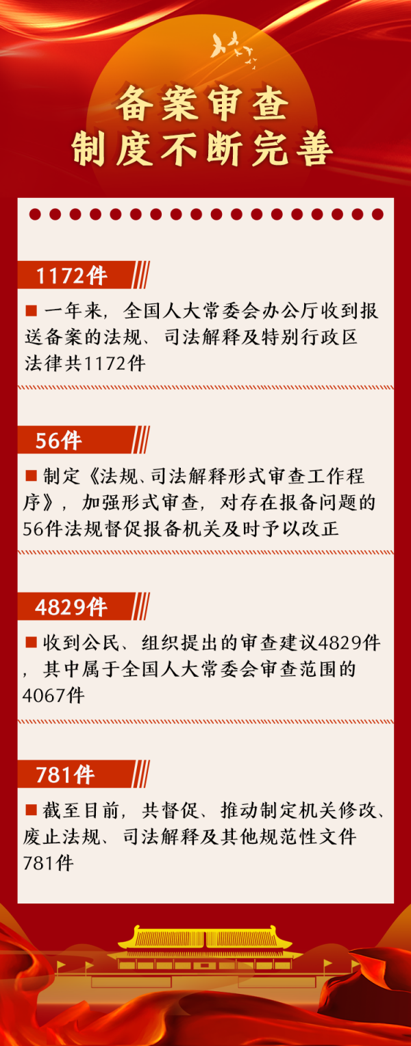 數(shù)字顯示,一年來,全國人大常委會辦公廳收到報送備案的法規(guī)、司法解釋及特別行政區(qū)法律共1172件。制定《法規(guī)、司法解釋形式審查工作程序》,加強形式審查,對存在報備問題的56件法規(guī)督促報備機關(guān)及時予以改正。收到公民、組織提出的審查建議4829件,其中屬于全國人大常委會審查范圍的4067件。