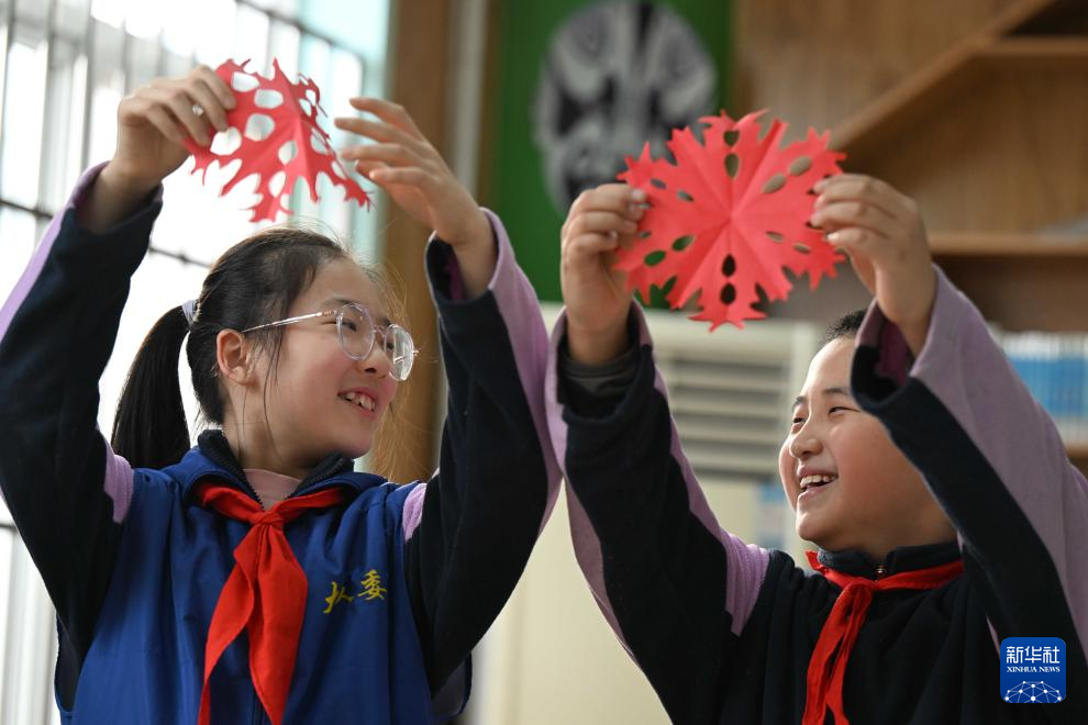 1月15日,河北省石家莊市裕華西路小學(xué)的學(xué)生在校園廟會(huì)活動(dòng)中展示自己剪的窗花。