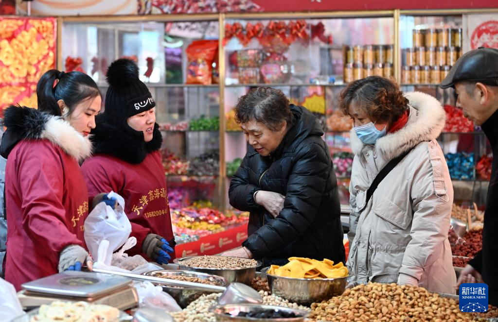 新春佳節(jié)臨近,在天津韓家墅海吉星農(nóng)產(chǎn)品批發(fā)市場(chǎng)舉辦的2024年天津市北辰區(qū)新春年貨節(jié)上,消費(fèi)者來來往往,熱鬧非凡。