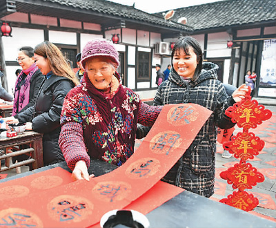 1月29日,四川省廣安市鄰水縣袁市鎮(zhèn)大光明社區(qū)的群眾在“翰墨迎春”文化下鄉(xiāng)活動現場領取春聯。張啟富攝(新華社發(fā))
