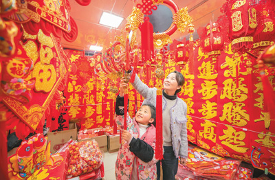 1月28日,江蘇省宿遷市宿豫區(qū)商貿城新年飾品賣場紅紅火火,年味十足;市民忙著挑選春節(jié)飾品,準備過年。徐江海攝(人民圖片)