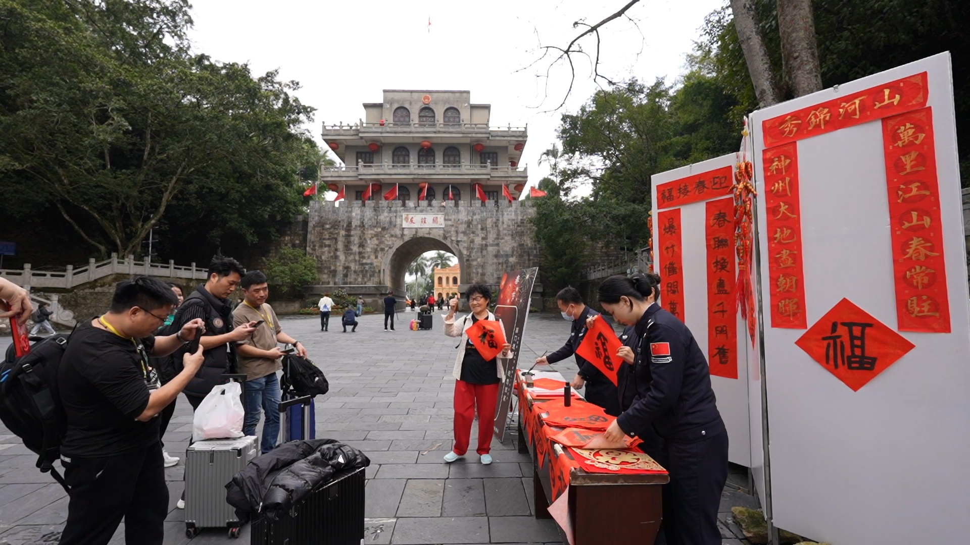 2月2日9時,千年雄關友誼關前人頭攢動,出入境旅客絡繹不絕,一片熱鬧的景象。廣西出入境邊防檢查總站友誼關出入境邊防檢查站移民管理警察在此為廣大旅客寫對聯送福字。