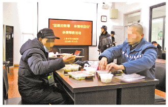 圖為軍天湖監(jiān)獄舉辦迎新春親情幫教活動(dòng)現(xiàn)場(chǎng),罪犯和家屬共進(jìn)“年夜飯”。