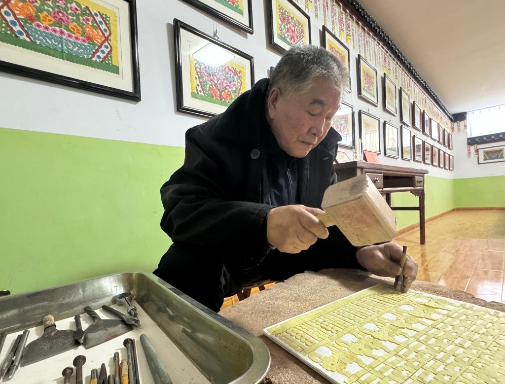 74歲的劉勝余拿著紙銼刀和小木槌,在一摞宣紙上依次鑿打出鏤空的花朵、銅錢和吉祥話語。兒子劉斌戴著指套,用細桿毛筆為形狀各異的宣紙逐層染上顏色……屋里滿是叮當敲打和罐罐茶在爐火上滾沸的咕嚕聲。