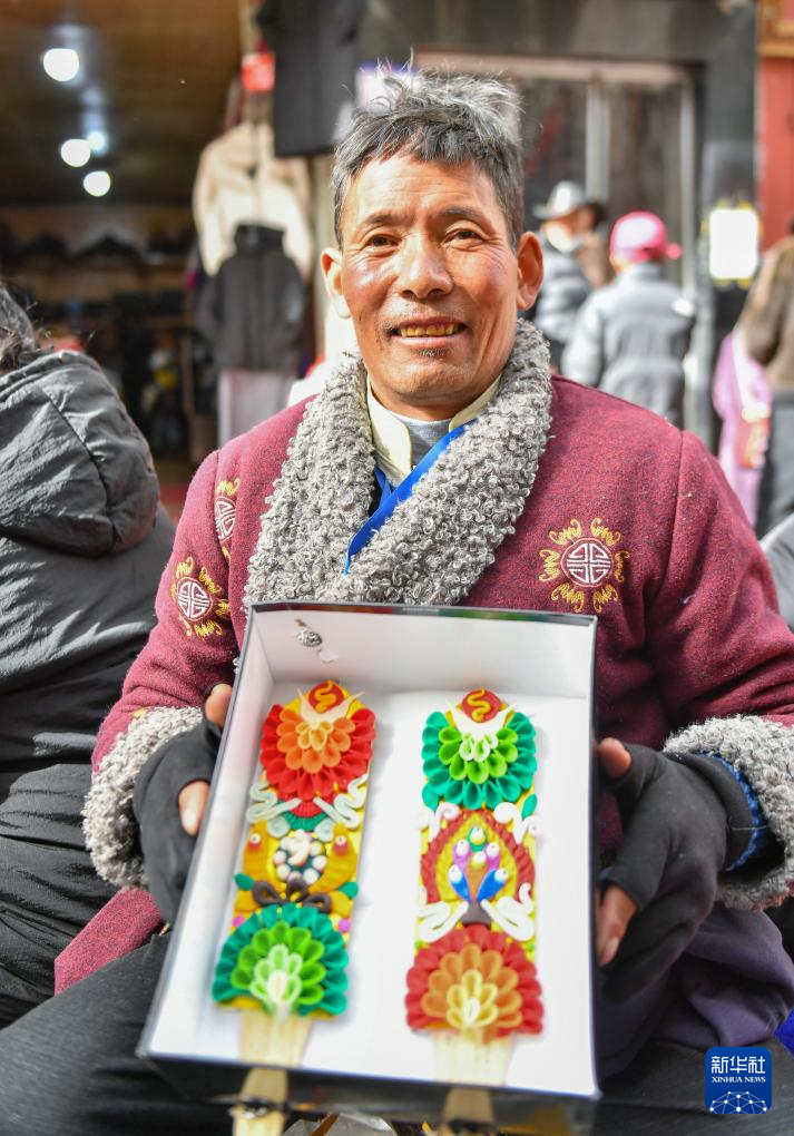 2月7日,在拉薩八廓商城,商販在展示售賣(mài)的酥油花。