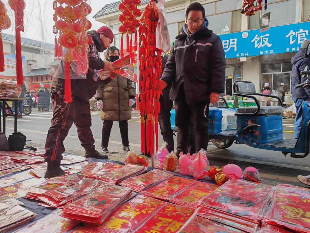 “每年小年一過,這大集是越趕越紅火。貼春聯(lián)是傳統(tǒng)年俗,家家戶戶都要買?!碧锸所i說著,為自家也選定了一副:萬事如意財運(yùn)來,新春大吉福門開?!靶碌囊荒?,求財、求運(yùn)、求福?!彼Φ?。出攤一上午,這位42歲的攤主在收付款到賬聲中忙得不亦樂乎。