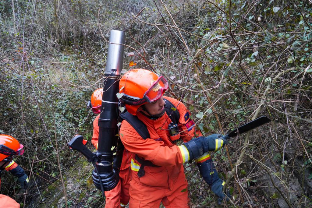 森林消防員利用砍刀開辟前進(jìn)道路。(甘肅省森林消防總隊供圖)