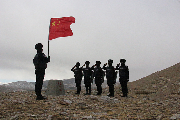 圖為民警在界樁前面向國(guó)旗莊嚴(yán)敬禮