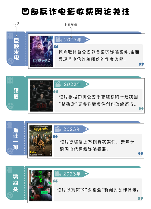 四部反電詐電影中,上映時(shí)間最早的是《巨額來電》,上映時(shí)間為2017年底,可以算作反電詐電影中的“前輩”。2022年5月10日,中宣部、公安部聯(lián)合啟動“全民反詐在行動”集中宣傳月活動,同年8月《獵屠》上映。2023年,公安機(jī)關(guān)對打擊電信網(wǎng)絡(luò)詐騙犯罪的力度不斷加大,宣傳力度隨之加強(qiáng),《孤注一擲》《鸚鵡殺》等兩部電影上映,引發(fā)輿論熱烈反響。以上四部電影均取材于真實(shí)案例,讓觀眾真實(shí)了解電信網(wǎng)絡(luò)詐騙的危害,進(jìn)而提升自身防范意識。