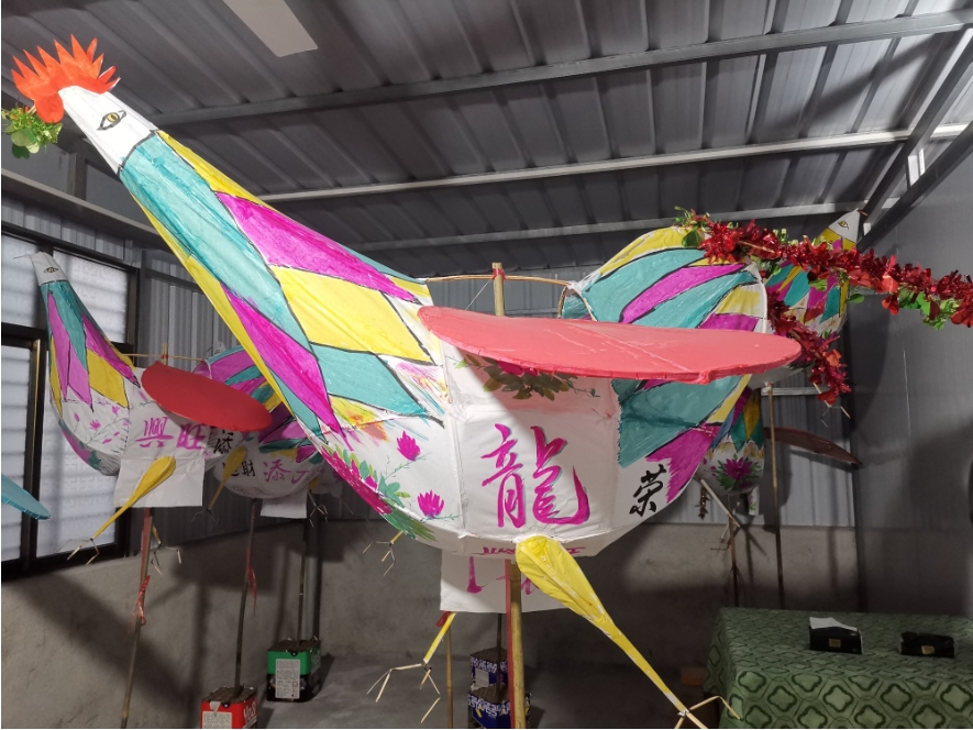 “客家方言中,‘燈’與‘丁’同音,雞公燈也寓意著財(cái)丁興旺?!敝苘矫饔么旨?xì)不一的竹子編出公雞外形,在竹架上糊上白紙,之后再上色,一個(gè)雞公燈便制作完成了。