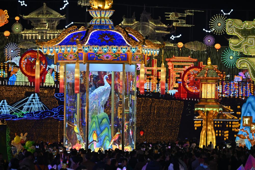 在四川自貢,3萬多名游客走進(jìn)“中國(guó)燈城”自貢中華彩燈大世界,觀彩燈、賞演藝、拍全家福。空中,600架無人機(jī)排列出湯圓、舞龍燈等圖樣;地面,舞龍舞獅等民俗表演輪番上演,上百名身著漢服的演員手提花燈巡游……