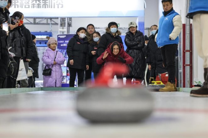 2023年12月16日,市民在首屆呼倫貝爾·海拉爾冰雪產(chǎn)品冬季展銷(xiāo)會(huì)上體驗(yàn)冰壺。新華社記者 王楷焱 攝