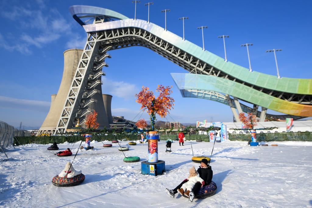 2023年12月24日,游客在首鋼滑雪大跳臺(tái)下的“首鋼園冰雪匯”體驗(yàn)雪上游樂(lè)項(xiàng)目。新華社記者 鞠煥宗 攝